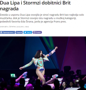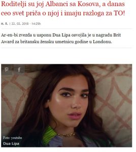 Këngëtarja e lindur në Londër në një familje të shqiptarëve të Kosovës ka nxjerr në shitje në vitin e kaluar albumin “Dua Lipa”, e cila menjëherë ka marrë kritika pozitive, shkruan ndër të tjerash portali serb B92.net.