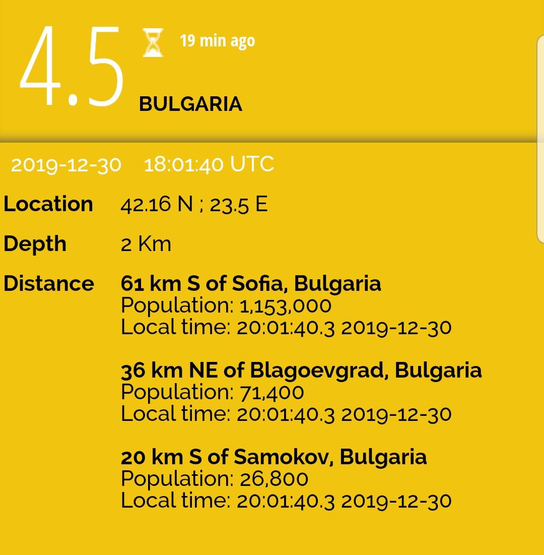 Një tërmet i fortë me magnitudë 4.5 i shkallës rihter është regjistruar ditën e sotme në Bullgari.