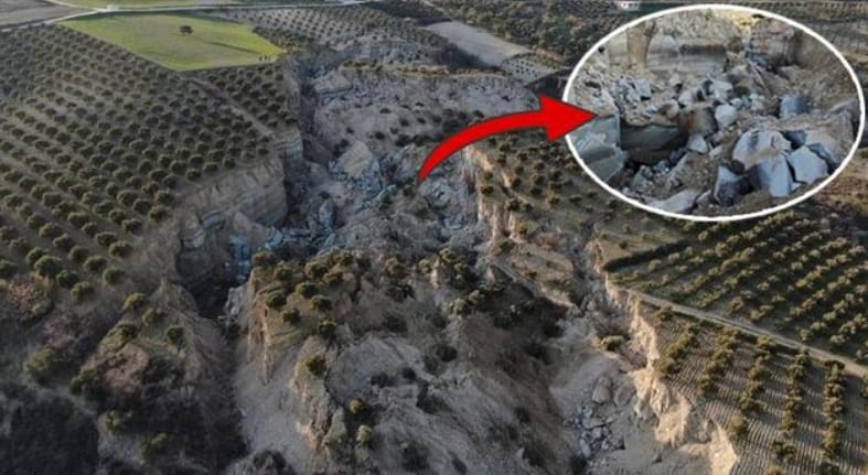 Pas tërmetit në Hatay të Turqisë, një çarje gjigante me një thellësi 30 metra dhe një gjerësi rreth 200 metra është konstatuar në një plantacion të madh me ullinj.