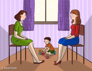 Ka dy zonja në një dhomë të cilat janë ulur përballë njëra-tjetrës, ndërsa një djalë i vogël luan në dysheme. Studioni mirë imazhin.