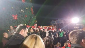 Shumë fëmijë të veshur me kapuçat e babagjyshit të vitit të Ri janë mbledhur në ‘Sheshin Skënderbej’ dhe po këndojnë e kërcejnë nën atmosferën e këngëve.