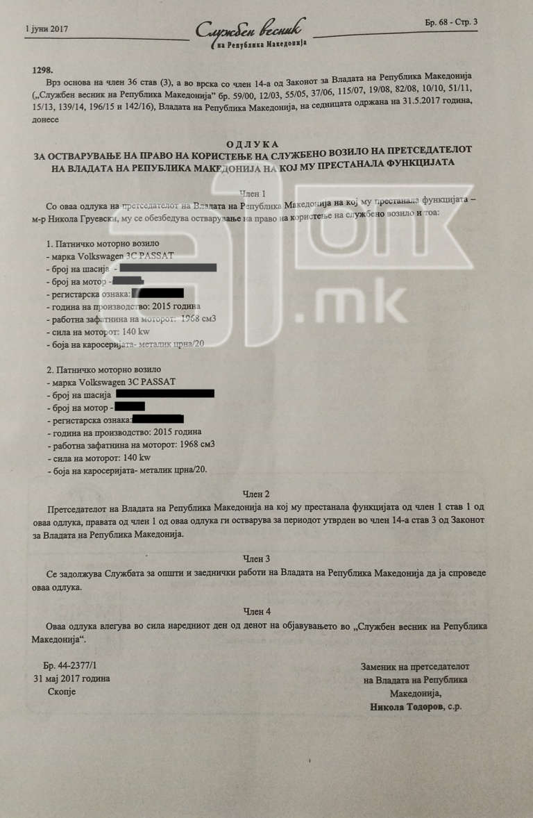 Ish-zëvendës kryeministri, Nikolla Todorov pak orë para se zgjidhjes së qeverisë së reformave të LSDM-së, solli vendim që ish-kryeministri Nikolla Gruevski të shfrytëzojë dy automjetet zyrtare, “Volkswagen Passat 3C”.