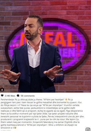 “Përshëndetje! Po ju shkruaj duke ju thene: “M’falni per heshtjen”. Po ju pergjigjem tani pasi i kam lexuar te gjitha mesazhet dhe komentet ku pyesni : Kur do filloje sezoni i ri? Nese ka nje arsye qe “M’fal per shprehjen” triumfoi vertete suksesshem, eshte fale punes, perkushtimit e mbeshtetjes se te gjithe stafit realizues si dhe faktit qe ai program, duhej te zgjaste aq sa zgjati.