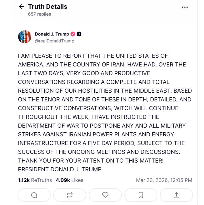 “Kam kënaqësinë të njoftoj se Shtetet e Bashkuara të Amerikës dhe Irani kanë zhvilluar gjatë dy ditëve të fundit bisedime shumë të mira dhe produktive lidhur me një zgjidhje të plotë dhe të gjithanshme të armiqësive tona në Lindjen e Mesme. Bazuar në tonin dhe përmbajtjen e këtyre bisedimeve të thella, të detajuara dhe konstruktive, të cilat do të vazhdojnë gjatë gjithë javës, kam udhëzuar Departamentin e Luftës që të shtyjë çdo dhe të gjitha sulmet ushtarake kundër termocentraleve dhe infrastrukturës energjetike iraniane për një periudhë pesë ditore, në varësi të suksesit të takimeve dhe diskutimeve në vazhdim. Ju faleminderit për vëmendjen ndaj kësaj çështjeje!