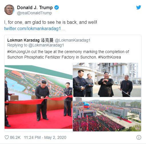 Presidenti i SHBA-ve, Donald Trump, ka konfirmuar ditën e djeshme se lideri i Koresë së Veriut është gjallë dhe mirë me shëndet. Trump ka publikuar në “Twitter” fotot e mediave lokale që tregonin Kim duke prerë shiritin e kuq në një fabrikë plehrash.