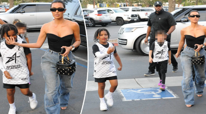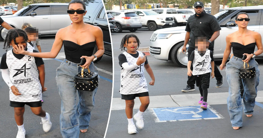 Kim, e veshur me një bluzë pa rripa dhe xhinse me bel të lartë, shihej duke ecur së bashku me djalin e saj dhe një shok të tij pas stërvitjes. I riu ishte ende i veshur me fanellën e tij të bardhë të basketbollit kur treshja u takuan nga fotografët në parkingun e një restoranti në Ishujt.