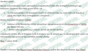 Panorama Sport ka mësuar ekskluzivisht se Skënderbeu është dënuar në vendimin e datës 7 shkurt 2018, nga komisionet disiplinore pranë organit më të lartë të organizatës europiane të futbollit.