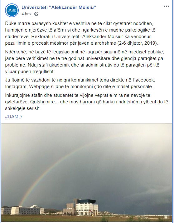 Duke marrë parasysh kushtet e vështira në të cilat qytetarët ndodhen, humbjen e njerëzve të afërm si dhe ngarkesën e madhe psikologjike të studentëve, Rektorati i Universitetit “Aleksandër Moisiu” ka vendosur pezullimin e procesit mësimor për javën e ardhshme (2-6 dhjetor, 2019).