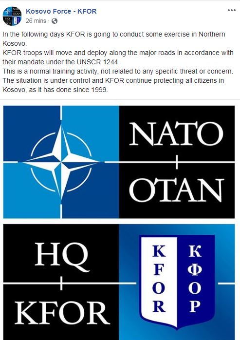 “Në ditët në vijim KFOR-i do të kryejë disa ushtrime në Kosovën Veriore. Trupat e KFOR-it do të lëvizin dhe vendosen përgjatë rrugëve kryesore në përputhje me mandatin e tyre nën RKSKB 1244”, thuhet ndër të tjera.