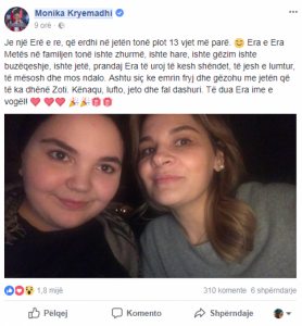 “Je një Erë e re, që erdhi në jetën tonë plot 13 vjet më parë. Era e Era Metës në familjen tonë ishte zhurmë, ishte hare, ishte gëzim ishte buzëqeshje, ishte jetë, prandaj Era të uroj të kesh shëndet, të jesh e lumtur, të mësosh dhe mos ndalo. Ashtu siç ke emrin fryj dhe gëzohu me jetën që të ka dhënë Zoti. Kënaqu, lufto, jeto dhe fal dashuri. Të dua Era ime e vogël!”- ka shkruar Kryemadhi.