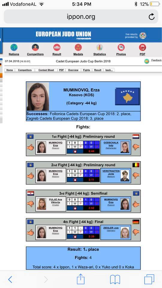 Xhudistja e re nga Kosova, Erza Muminoviq ka fituar medaljen e artë në Kupën Evropiane, e cila po mbahet në Berlin të Gjermanisë.