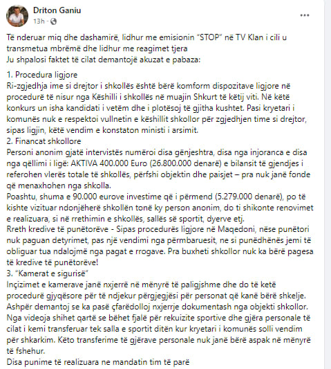 Ndërkohë vetë Driton Ganiu ka demantuar akuzat e pa baza duke i shpalosur me disa pika.