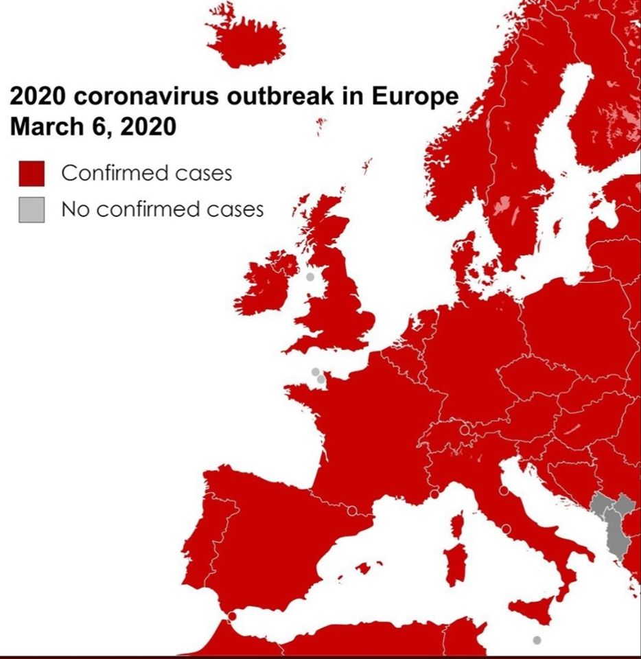 Deri më datën 6 mars, kanë mbetur vetëm Kosova, Shqipëria, Qipro dhe Mali i zi të cilët ende nuk kanë konfirmuar ndonjë rast të prekur me koronavirus.