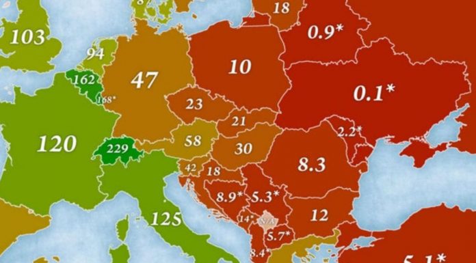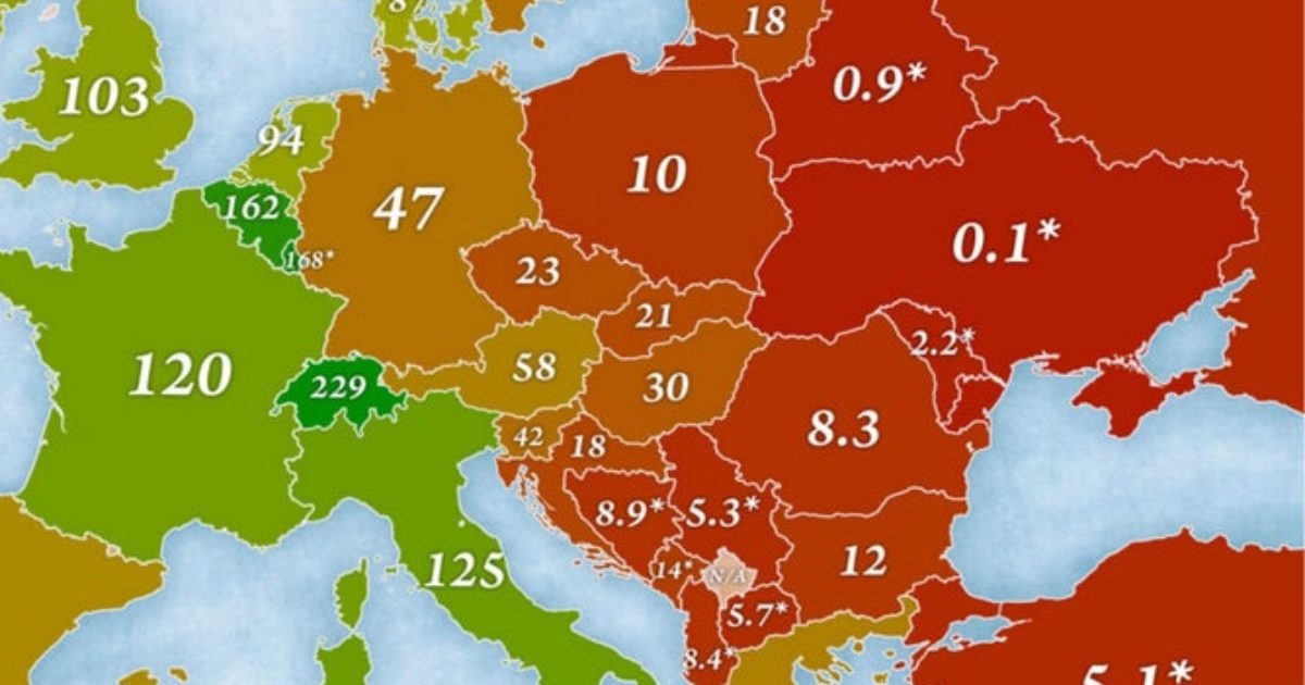 Jakub Marian ka treguar nëpërmjet një harte pasurinë mesatare në Evropë. Të dhënat bazohen në analizën e Credit Suisse, botuar çdo vit në raportin e pasurisë së tyre.