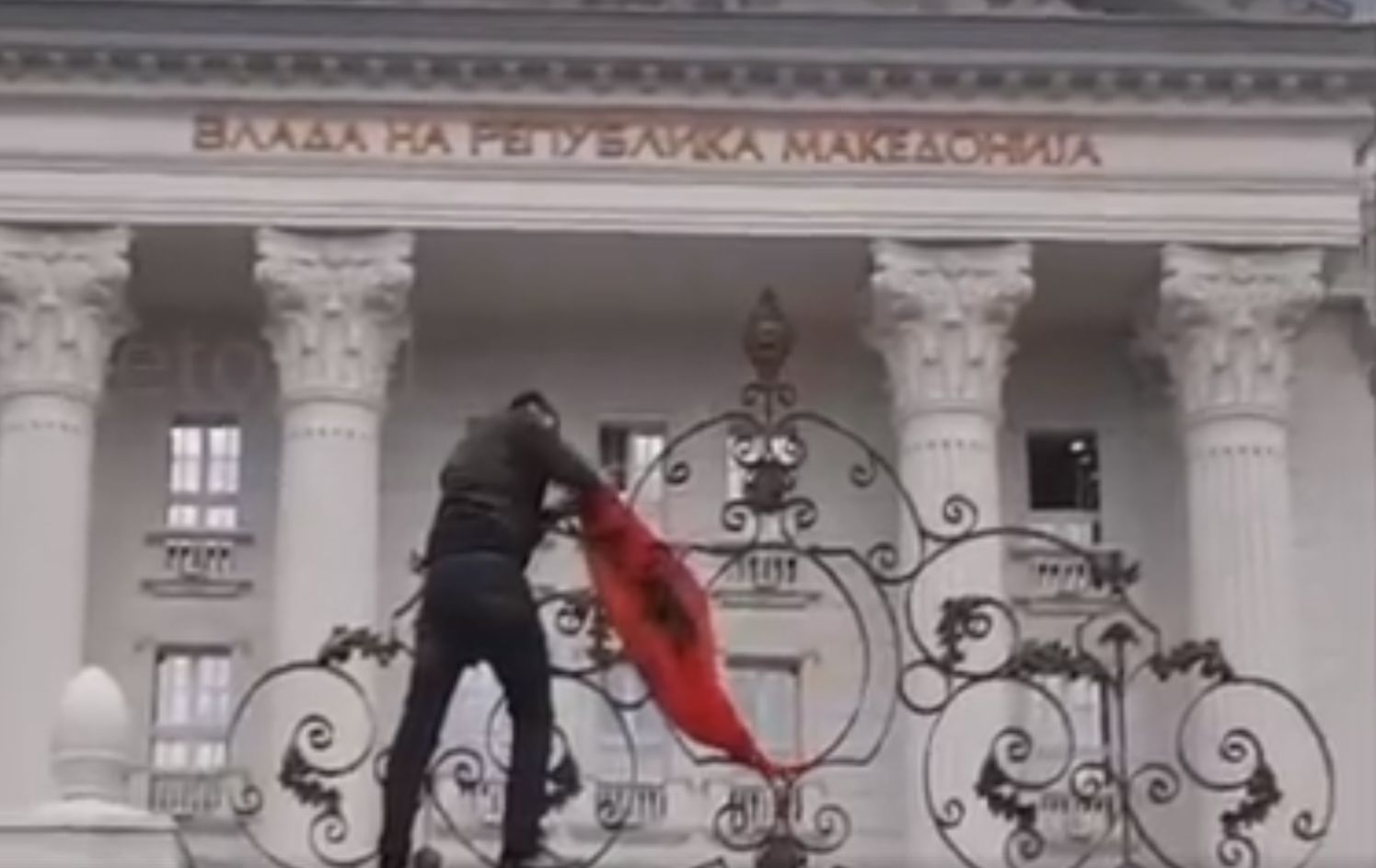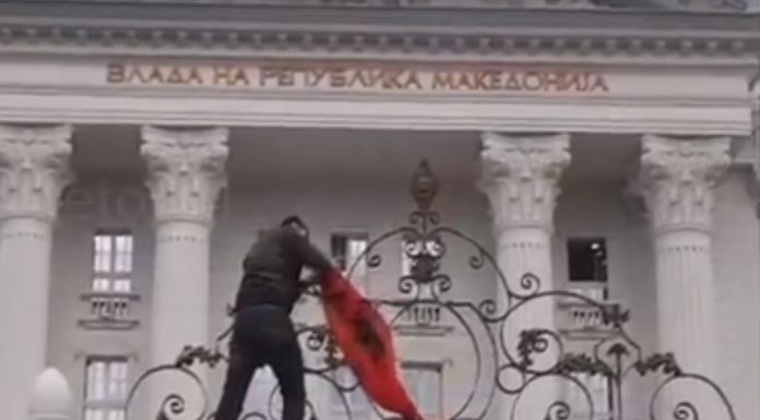 Nga një protestues, në mbyllje të protestës me moton “Drejtësi për Almirin” u vendos flamuri shqiptarë në derën e obrorit të qeverisë së Maqedonisë.