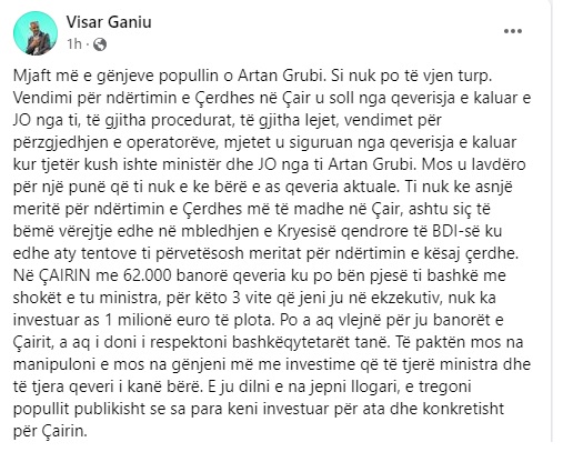 Kryetari i komunës së Çairit, Visar Ganiu për dy vite ka harruar shumë, çka ka thënë e çka ka bërë. Në vitin 2020 ka falemenderuar qeverinë për mbështetjen e madhe që i jep komunës së Çairit gjegjësisht për ndërtimin e çerdhes Fidani një ndër çerdhet më të mëdha në vend.