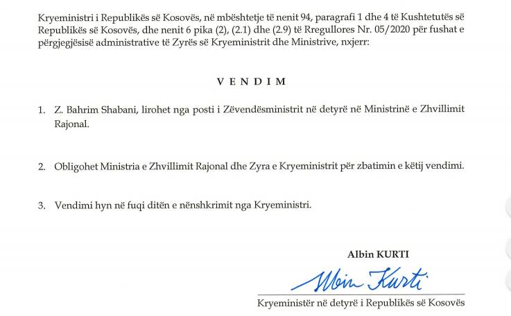 Kryeministri në detyrë, Albin Kurti, ka marrë vendim për lirimin nga posti i zëvendësministrit në detyrë në Ministrinë e Zhvillimit Rajonal, Bahrim Shabani, teksa ende nuk janë bërë të ditura shkaqet për këtë.