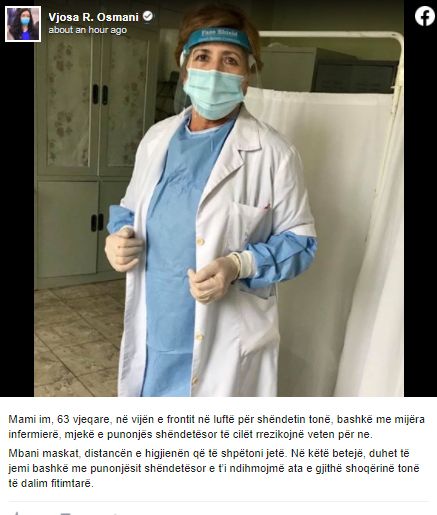 Osmani ka shkruar se nëna e saj 63-vjeçare, është në vijën e frontit në luftë për shëndetin tonë, bashkë me mijëra infermierë e punonjës kundër COVID-19.