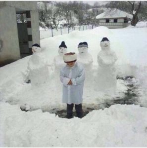 Por nëse të rriturit – prindërit japin shembuj të mirë për më të vegjëlit, rezultatet do të jenë të lakmueshme. Kështu ndodhë edhe në fotografinë e mëposhtme ku një fëmijë i vogël ka ndërtuar njeri prej bore – dordolec, dhe i ka bërë ata xhemat, ndërsa vet është bërë imam.
