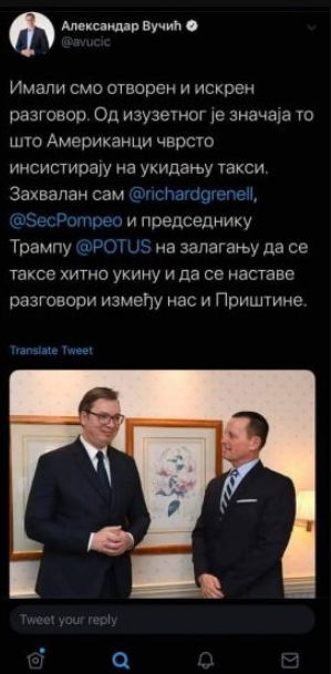 “Patëm një bisedë të hapur dhe të sinqertë. Është me shumë rëndësi që Amerikanët insistojnë në heqjen e taksës. Unë jam mirënjohës ndaj Ambasadorit Grenell, sekretarit Pompeo dhe presidentit Trump për angazhimin e tyre për të hequr tarifat dhe për të vazhduar diskutimet midis nesh dhe Prishtinës”, ka shkruar Vuçiq.