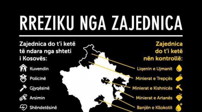 Lëvizja VETËVENDOSJE! i dënon shprehjet supremaciste dhe shovene ndaj shqiptarëve që u thanë publikisht në këtë takim. Ne dënojmë gjithashtu qëndrimet e tyre kundër institucioneve të vendit. Takimi i sotëm dhe qëndrimet e shprehura aty janë në kundërshtim me shtetin e së drejtës, kuadrin ligjor dhe rendin kushtetues të vendit, duke synuar cenimin e drejtpërdrejtë të sovranitetit të Republikës së Kosovës. Qytetarët e Kosovës, institucionet e vendit, shqiptarët anembanë, nuk mund të qëndrojnë duarkryq e të lejojnë krijimin dhe themelimin e “Zajednicës”. Ky projekt është kundërshtuar me peticionin më të madh qytetar dhe me protestat më të mëdha qytetare në Kosovën e pasluftës, si dhe është hedhur një herë poshtë nga Gjykata Kushtetuese e Kosovës në vendimin e datës 23 dhjetor 2015, që konfirmon se “Zajednica” bie ndesh me 23 nene të Kushtetutës së Kosovës. “Zajednica” është projekt politikisht i vdekur dhe ne nuk mund të lejojmë ringjalljen e saj.