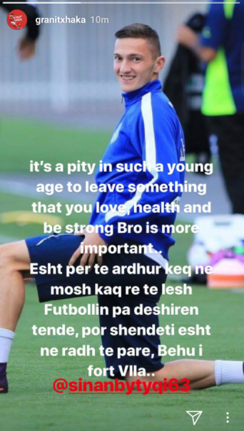 “Është për të ardhur keq që në moshë kaq të re ta lësh futbollin pa dëshirën tënde, por shëndeti është në radhë të parë. Bëhu i fortë vëlla”, ka shkruar Xhaka në rrjetet sociale. /Telegrafi