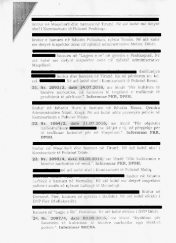 Çdo shkresë përmban një apo disa emra dhe të dhënat përkatëse personale të punonjësve të policisë, të cilët hartuesit e saj i akuzojnë për përfshirje në kultivimin dhe trafikun e drogës, si dhe njësinë policore dhe postin që ata kanë në momentin e dërgimit të shkresës.