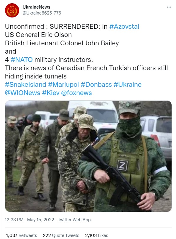 Llogaritë pro-ruse në Twitter dhe Facebook kanë pohuar se një admiral amerikan në pension me emrin Eric Olson u dorëzua me një grup ushtarësh ukrainas në fabrikën e çelikut Azovstal, një fabrikë ku ushtarët e fundit të mbetur në Mariupol u përballën me ushtrinë ruse.