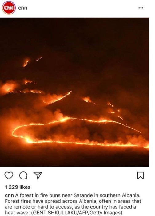 CNN shkruan në instagramin e saj zyrtar duke shpjeguar se zjarret në Shqipëri janë përhapur në të gjithë territorin, më së shumti në zona të vështira për t’u arritur.