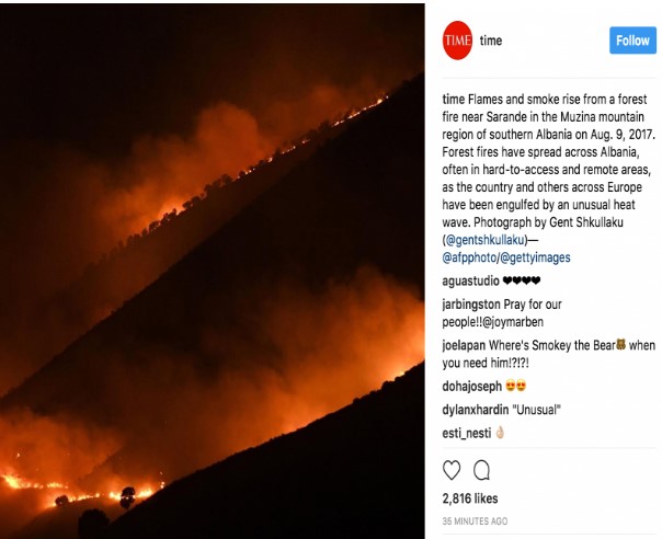 Ndërsa revista Time gjithashtu ka publikuar në Instagram një tjetër foto, të po të njëjtit zjarr në Sarandë me një përshkrim të ngjashëm të asaj të CNN./Gazeta Express