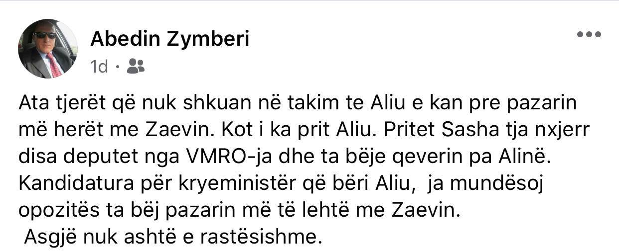 “Ata tjerët që nuk shkuan në takim te Aliu e kanë pre pazarin më herët me Zaevin. Kot i ka prit Aliu. Pritet Sasha tja nxjerr disa deputet nga VMRO-ja, dhe të bëjë qeverinë pa Alinë. Kandidatura për kryeministër që bëri Aliu ia mundësoi opozitës ta bëjë pazarin më të lehtë me Zavin. Asgjë nuk është e rastësishme” ka shkruar Zymberi